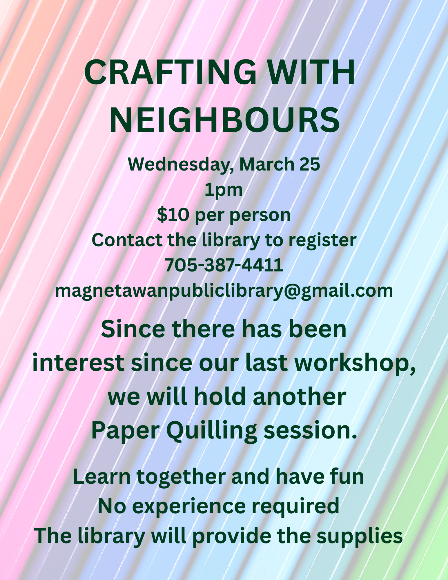 Join us at the library and learn the art of paper quilling! $10/person, please register by calling or coming into the library.