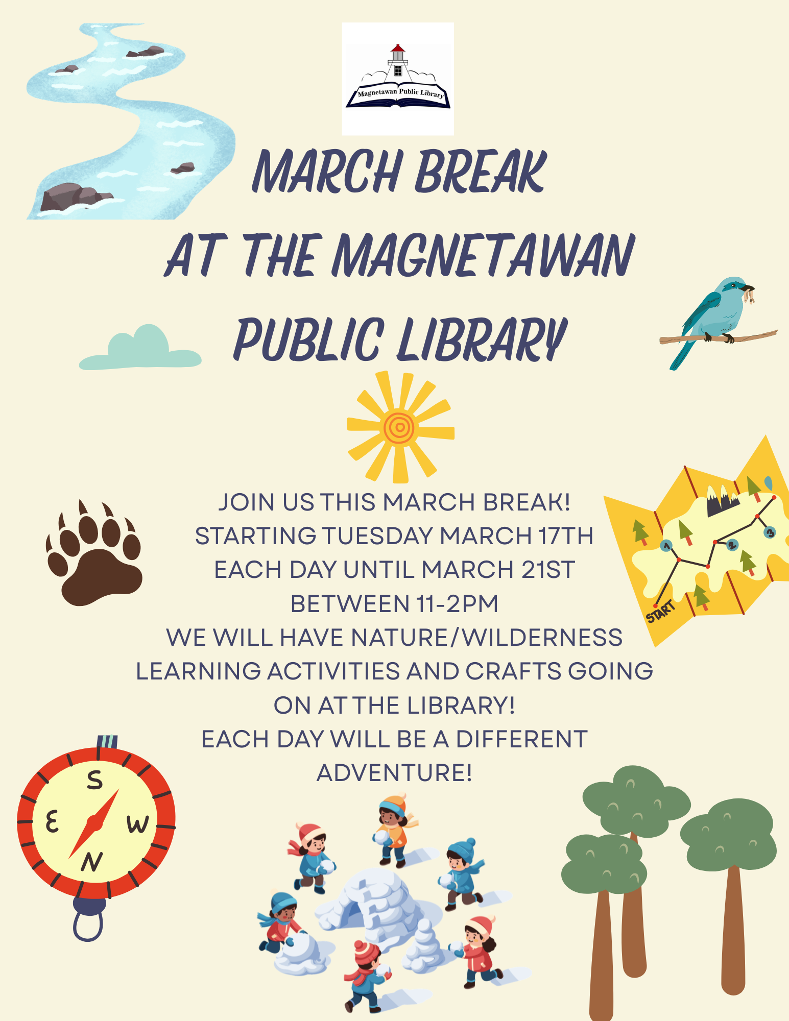 Join us for March Break at the Library! Starting Tuesday March 17th, each day from 11am - 2pm we will be having crafts and activities at the library! Follow us on Facebook to find what's happening each day!